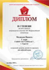 За высокий уровень знаний по предмету Дипломом победителя XIV Всероссийской олимпиады по английскому языку награжден студент 1 курса Тимофей Маляков. Дипломами II степени награждены Константин Садков (2 курс) и Никита Медведев (1 курс).