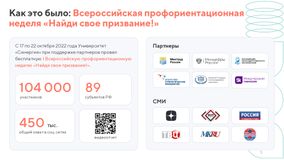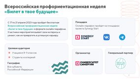 Мероприятие проводится Университетом «Синергия» совместно с Фондом Гуманитарных Проектов — оператором проекта ранней профессиональной ориентации обучающихся 6-11 классов «Билет в будущее» при поддержке Комитета Государственной Думы по молодежной политике. Задача Всероссийской профориентационной недели – помочь участникам построить индивидуальную образовательную траекторию. В течение недели на онлайн-площадках