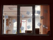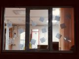 С помощью сверкающих гирлянд и ожурных снежинок, мы создали на стеклах волшебный мир, который виден с улицы. Каждое окно теперь говорит: «Здесь живёт праздник!».