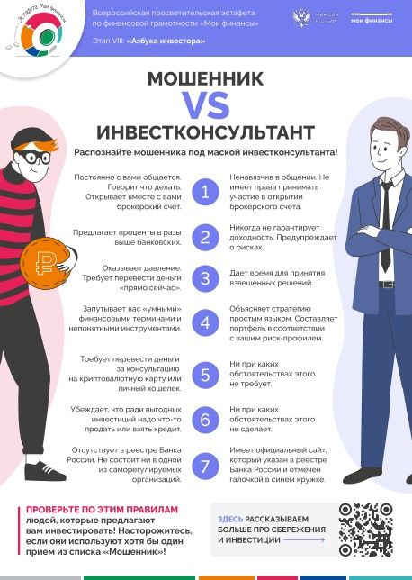 Тема данного этапа: "Азбука инвестора". Предлагаем ознакомиться с плакатом «Распознай мошенника под маской инвестконсультанта».