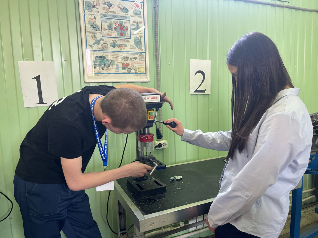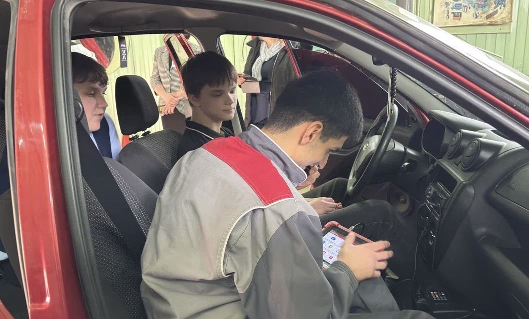 Школьники на практике познакомились с профессиями сферы технического обслуживания автомобилей под руководством опытных наставников. Ребята получили ценный опыт: нарезали резьбу, сверлили отверстия, выполняли компьютерную диагностику автомобиля и участвовали в замене ремня ГРМ.
