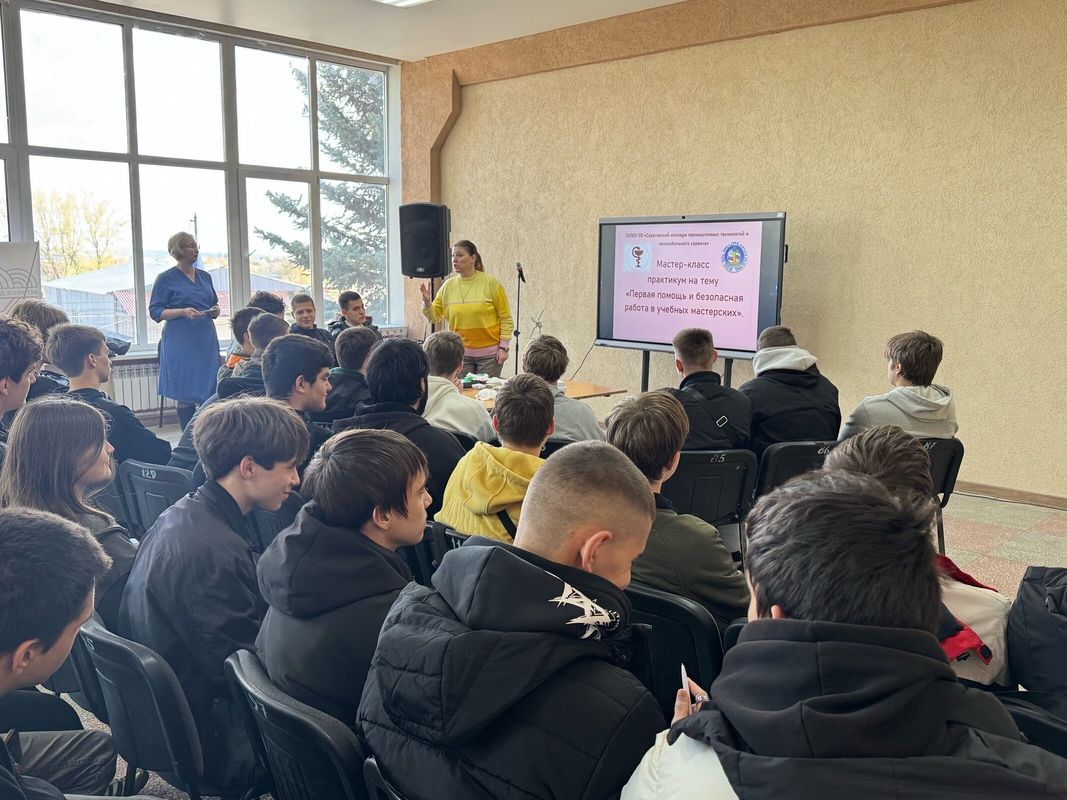 В рамках празднования Всемирного дня охраны труда в нашем учебном заведении прошёл мастер‑класс‑практикум на тему «Первая помощь и безопасная работа в учебных мастерских». Занятие провела наш медик — Татьяна Антоновна.